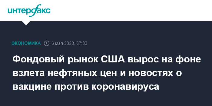Москва. 6 мая. INTERFAX.RU - Американские фондовые индексы выросли по итогам торгов во вторник. Оптимизм инвесторов поддерживал взлет нефтяных цен и сообщения о новой фазе в разработке вакцины от коронавируса.