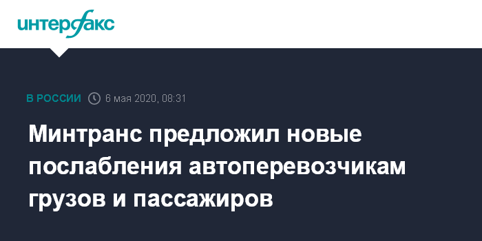 Москва. 6 мая. INTERFAX.RU - Минтранс направил правительству предложения по новым мерам поддержки транспортных компаний, в частности, об отмене ряда налогов и сборов. Предложения касаются в первую очередь автотранспорта и авиации, пишет "Коммерсантъ". В первом пакете предложений министерства автотранспорт не упоминался.