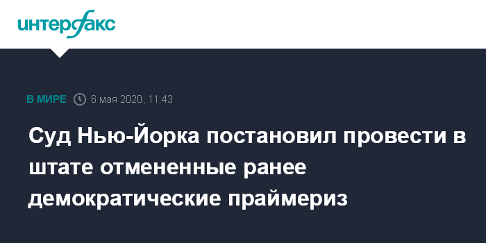 Москва. 6 мая. INTERFAX.RU - Федеральный судья США издал распоряжение о проведении в июне президентских демократических праймериз в штате Нью-Йорк, отмененных ранее из-за пандемии COVID-19, сообщила в среду газета The New York Post.