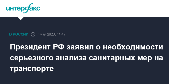 Москва. 7 мая. INTERFAX.RU - Серьезный анализ санитарных, профилактических мер во всех отраслях, в том числе и на транспорте, понадобится после спада эпидемии коронавируса, заявил президент РФ Владимир Путин.