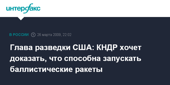 Вашингтон. 26 марта. INTERFAX.RU - Северная Корея стремится доказать международному сообществу, что способна успешно запускать межконтинентальные баллистические ракеты, считает директор Национальной разведки США Деннис Блэр.