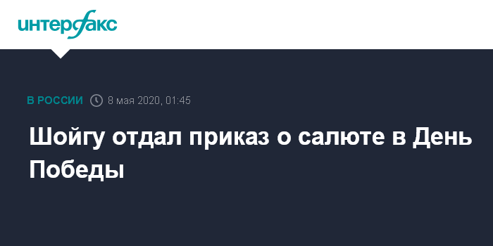 Министр приказал 9 мая в 22:00 по местному времени произвести артиллерийские салюты с привлечением воинских частей в Москве, городах-героях Волгограде, Керчи, Мурманске, Новороссийске, Санкт-Петербурге, Севастополе, Смоленске, Туле, а также в городах, где дислоцированы штабы военных округов, флотов, общевойсковых армий и Каспийской флотилии.