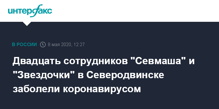Москва. 8 мая. INTERFAX.RU - Двадцать случаев COVID-19 зафиксированы среди сотрудников машиностроительного предприятия оборонного комплекса АО "Севмаш" и центра судоремонта "Звездочка" в Северодвинске (Архангельская область), сообщили "Интерфаксу" в региональном управлении Роспотребнадзора.
