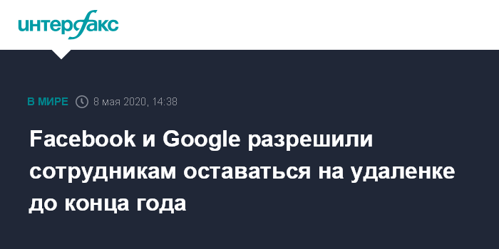 Москва. 8 мая. INTERFAX.RU - Facebook и Google объявили, что разрешат сотрудникам, которые могут работать из дома, остаться в этом режиме по желанию до конца 2020 года, сообщает BBC News. Обе компании при этом начнут открывать свои офисы, но продолжат придерживаться гибкого графика.