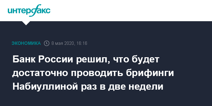 Москва. 8 мая. INTERFAX.RU - Глава Банка России Эльвира Набиуллина изменит периодичность проведения пресс-конференций по текущей ситуации и вопросам стабилизационных мер, станет проводить их реже.