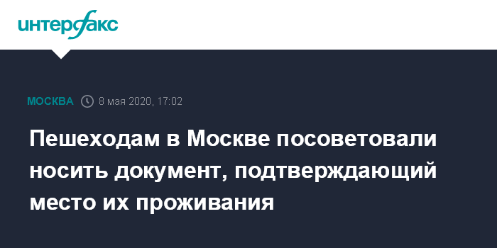 Москва. 8 мая. INTERFAX.RU - Пешеходам в столице рекомендуется носить с собой паспорт, а также любой документ, который мог бы подтвердить проживание человека по конкретному адресу, сказал "Интерфаксу" министр правительства Москвы, начальник главного контрольного управления города Евгений Данчиков.