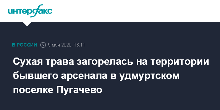 Москва. 9 мая. INTERFAX.RU -Сухая трава загорелась на территории бывшего артиллерийского арсенала в удмуртском поселке Пугачево в субботу, опасности для населения нет, сообщил глава Малопургинского района Сергей Юрин.