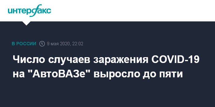 Москва. 9 мая. INTERFAX.RU - Еще два случая заражения коронавирусной инфекцией подтверждено среди сотрудников АО "АвтоВАЗ", общее количество инфицированных увеличилось до пяти человек, сообщила первичная профсоюзная организация завода на своей официальной странице во "Вконтакте".