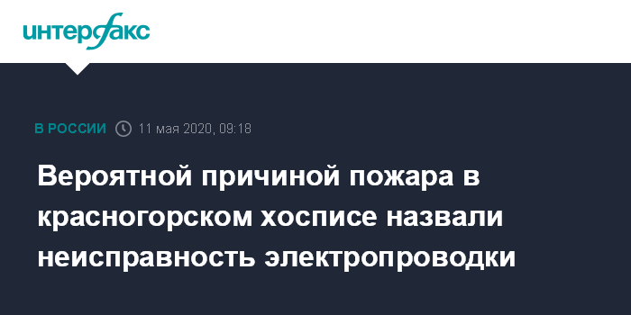 Москва. 11 мая. INTERFAX.RU - По предварительным данным, причиной ночного пожара на территории красногорского частного хосписа, явилась неисправность электропроводки, сообщила представитель областного главка Следственного комитета (СК) Ольга Врадий.