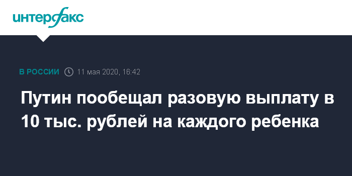 Москва. 11 мая. INTERFAX.RU - В рамках дополнительных мер поддержки граждан в период пандемии предусмотрены разовые выплаты на каждого ребенка, объявил президент РФ Владимир Путин на совещании с регионами по санитарно-эпидемической ситуации.