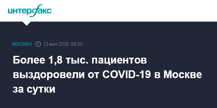Москва. 12 мая. INTERFAX.RU - Московские врачи вылечили от коронавируса в общей сложности 19 642 человека, за сутки выздоровели 1 820 пациентов, сообщила заместитель мэра столицы по вопросам социального развития Анастасия Ракова журналистам во вторник.