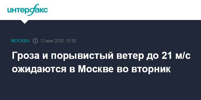 "С 11:00 часов до конца суток 12 мая в городе Москве ожидается кратковременный дождь, местами гроза, усиление юго-западного, западного ветра с порывами 16-21 м/с", - сказали "Интерфаксу" в столичном главке МЧС. В ведомстве предупредили автомобилистов о необходимости соблюдать скоростной режим и дистанцию.