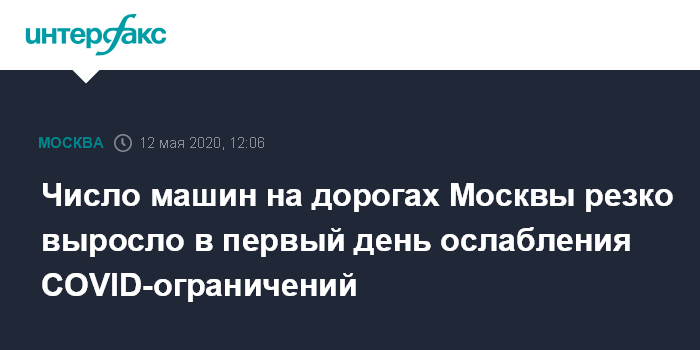 Москва. 12 мая. INTERFAX.RU - В первый день ослабления ограничений в связи с режимом повышенной готовности на дорогах Москвы почти на 200 тыс. выросло число автомобилей, сообщили "Интерфаксу" в пресс-службе департамента транспорта столицы.