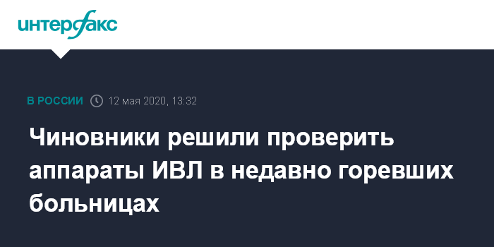 Москва. 12 мая. INTERFAX.RU - Росздравнадзор начал проверять качество и безопасность аппаратов ИВЛ, которые установлены в больницах, где недавно были пожары. Об этом сообщила пресс-служба ведомства.