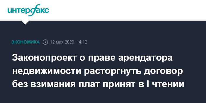 Москва. 12 мая. INTERFAX.RU - Госдума приняла в первом чтении законопроект, который позволяет добросовестным арендаторам, которые заключили договоры аренды недвижимости до введения режима повышенной готовности из-за COVID-19, в одностороннем порядке расторгнуть договор аренды без взимания любых плат и с возвратом обеспечительного платежа.