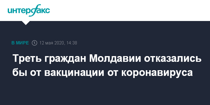 Москва. 12 мая. INTERFAX.RU - Только чуть половина граждан Молдавии (52,3%) согласились бы на вакцинацию от COVID-19, если бы существовала такая вакцина. Об этом свидетельствует результаты опроса общественного мнения Vox Populi, представленного во вторник на пресс-конференции в Кишиневе Ассоциацией социологов и демографов Молдовы.