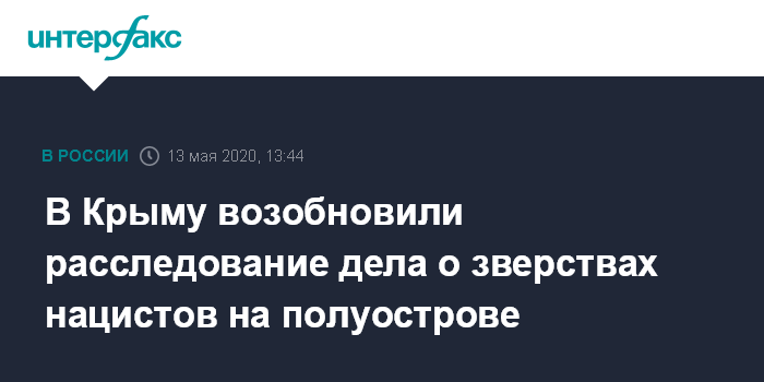 Москва. 13 мая. INTERFAX.RU - Верховный суд Крыма на заседании в среду отменил постановление о прекращении уголовного дела о массовых зверствах нацистов на полуострове; таким образом, было возобновлено расследование преступлений в годы войны 1941-1945 годов.