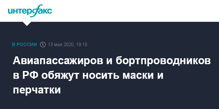 Москва. 13 мая. INTERFAX.RU - На борту каждого воздушного судна пассажирам выдадут маски и перчатки и попросят носить в течение всего полета, соответствующие рекомендации для авиационной отрасли опубликовал в среду Роспотребнадзор.