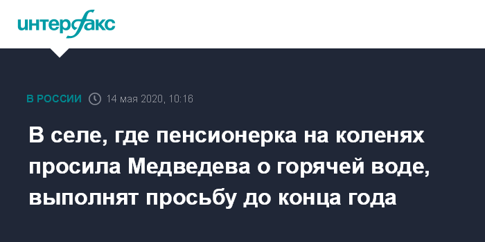 Москва. 14 мая. INTERFAX.RU - Министр строительства и ЖКХ Алтайского Края Иван Гилев отчитался о продолжении работ по наладке горячего водоснабжения в селе Санниково. 13 ноября 2019 года местная пенсионерка Татьяна Кадукина упала на колени перед премьер-министром Дмитрием Медведевым и пожаловалась, что несколько домов с 2016 года стоят без горячей воды.