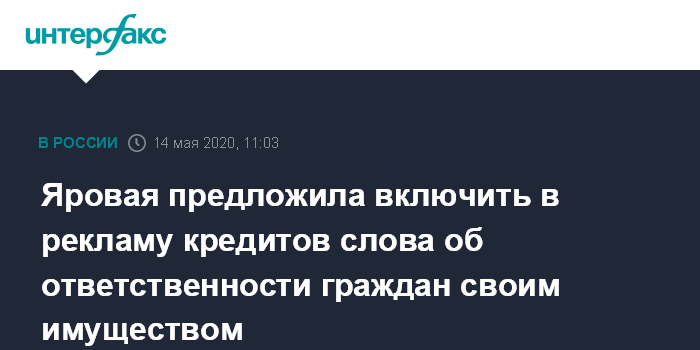 Москва. 14 мая. INTERFAX.RU - Вице-спикер Госдумы Ирина Яровая внесла в парламент законопроект, который обязует снабжать каждое рекламное сообщение о выдаче кредита или займа предупреждением о том, что гражданин отвечает по своим обязательствам принадлежащим ему имуществом.