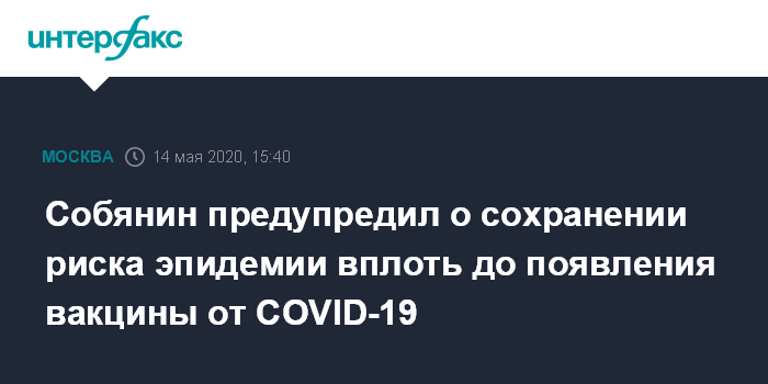 Москва. 14 мая. INTERFAX.RU - Риск распространени коронавируса в Москве будет сохранятсья до тех пор, пока не пройдет эффективная вакцинация, заявил мэр города Сергей Собянин. В связи с этим он предупредил, что до того момента придется выходить из самозиоляции с соблюдением всех необходимых предосторожностей.