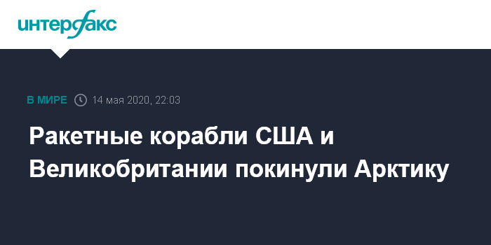 Москва. 14 мая. INTERFAX.RU - Американо-британская корабельная ударная группа, находившаяся в Арктике, покинула морские районы за Полярным кругом, следует из данных 6-го оперативного флота США.