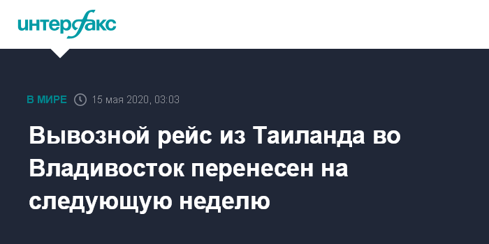Москва. 15 мая. INTERFAX.RU - Запланированный на пятницу, 15 мая, вывозной рейс из Таиланда в РФ перенесен на понедельник, также изменен маршрут, сообщается в телеграм-канале Минкомсвязи, созданном для информирования россиян о вывозе из других стран в связи с ситуацией с коронавирусом.