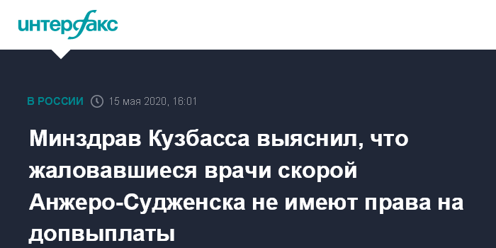 Москва. 15 мая. INTERFAX.RU - Записавшие видеообращение сотрудники скорой помощи Анжеро-Судженска, которые пожаловались на невыплату денег за работу с коронавирусными больными, не имеют права на эти доплаты, ответил глава Минздрава Кузбасса Михаил Малин на запрос "Интерфакса".