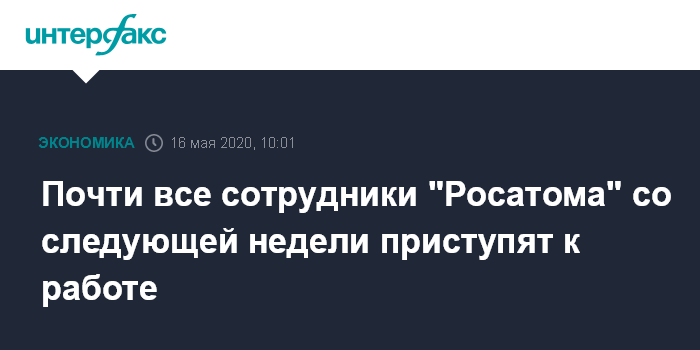 Москва. 16 мая. INTERFAX.RU - Почти все сотрудники ГК "Росатом" со следующей недели приступят к работе, сообщил глава госкорпорации Алексей Лихачев в очередном видеообращении, размещенном на сайте "Росатома".