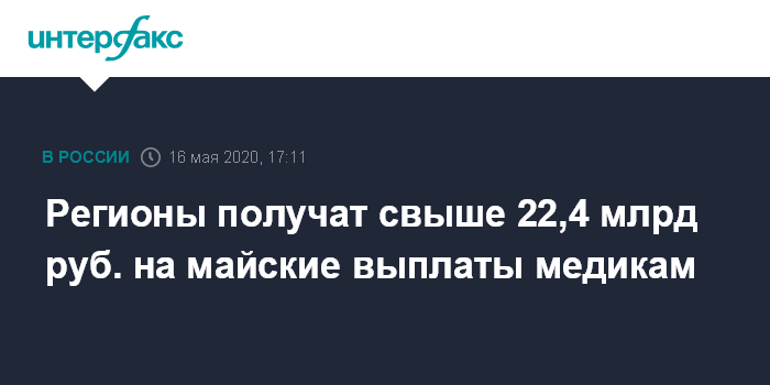 Москва. 16 мая. INTERFAX.RU - Правительство РФ утвердило выделение регионам более 22,4 млрд рублей для майских выплат медицинским работникам, борющимся с коронавирусом.