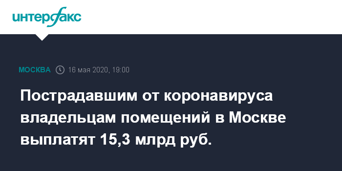"Москва утвердила порядок выделения грантов собственникам коммерческой недвижимости. В первую очередь деньги получат те владельцы помещений, которые сделали скидки для своих арендаторов. Поддержка охватит 6 500 предпринимателей, которые самостоятельно используют или сдают в аренду площади под торговлю, общепит, бытовые услуги или гостиницы", - сообщили "Интерфаксу" в субботу в столичном оперативном штабе по экономике.