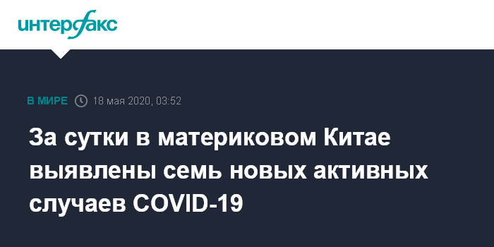 Москва. 18 мая. INTERFAX.RU - В материковом Китае за истекшие сутки были зарегистрированы семь новых случаев активного протекания вызванных коронавирусом заболеваний и 18 бессимптомных больных, сообщил Госкомздрав КНР на своем официальном сайте.