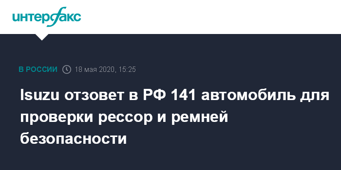 Москва. 18 мая. INTERFAX.RU - Официальный производитель и дистрибьютор автомобильной Isuzu в РФ (АО "Исузу Рус") отзывает в РФ 141 автомобиль, следует из данных Росстандарта.