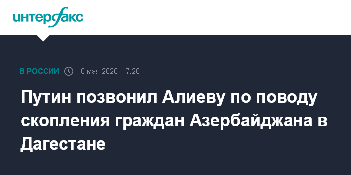 Москва. 18 мая. INTERFAX.RU - Президенты РФ и Азербайджана Владимир Путин и Ильхам Алиев обсудили по телефону ситуацию в приграничных районах Дагестана, где скопилось большое количество граждан Азербайджана, желающих выехать домой.