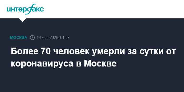 Москва. 19 мая. INTERFAX.RU - Количество умерших от коронавируса в Москве увеличилось с 1580 до 1651, сообщили "Интерфаксу" в оперштабе по контролю и мониторингу ситуации с коронавирусом в Москве.
