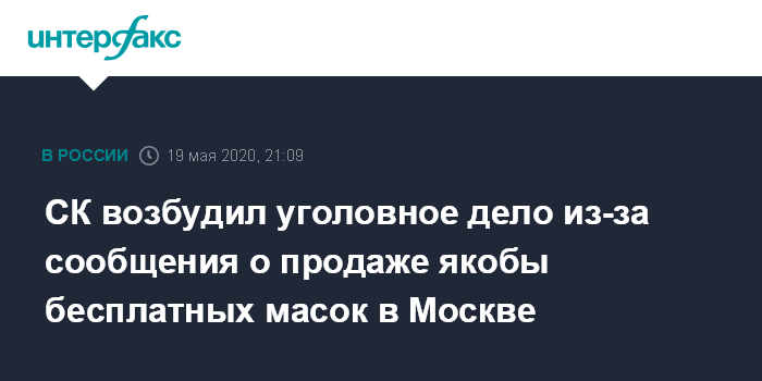 СК возбудил уголовное дело из-за сообщения о продаже якобы бесплатных масок в Москве