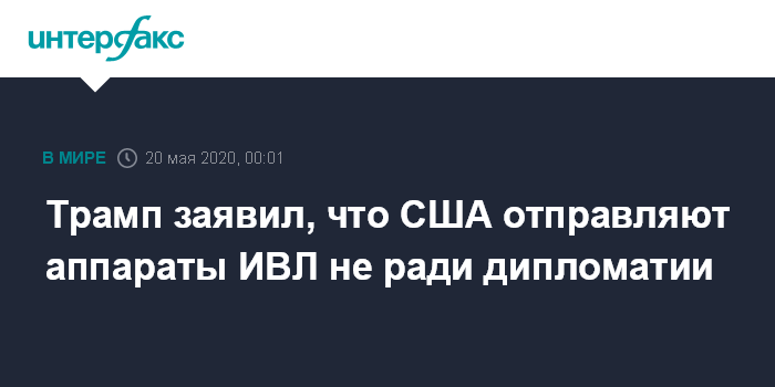 Москва. 20 мая. INTERFAX.RU - Цель поставок американских аппаратов ИВЛ в другие страны - спасать жизни, а не выполнять дипломатические задачи, заявил во вторник президент США Дональд Трамп.