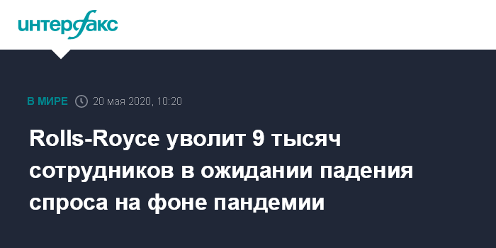 Москва. 19 мая. INTERFAX.RU - Британский машиностроительный холдинг Rolls-Royce Holdings Plc планирует уволить 9 тысяч сотрудников в рамках масштабной реструктуризации. Она объясняется ожиданием сокращения спроса со стороны производителей гражданских самолетов на фоне пандемии коронавируса COVID-19.