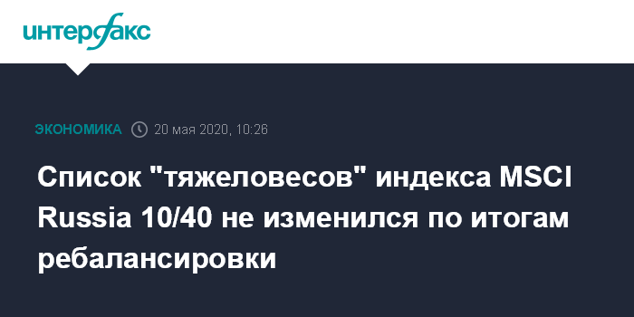 Москва. 20 мая. INTERFAX.RU - Список "тяжеловесов" индекса MSCI Russia 10/40, который строится на основе индекса MSCI Russia Standard, по итогам ребалансировки не изменился, говорится в сообщении индексного провайдера MSCI, как и ожидалось.