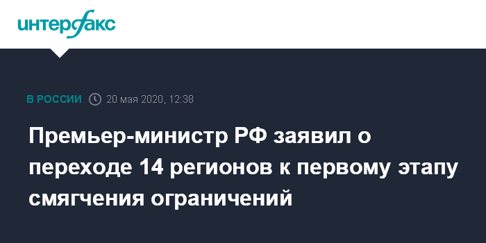 Москва. 20 мая. INTERFAX.RU - Уже 14 регионов приняли решение о смягчении ограничений в связи с коронавирусом в рамках первого этапа, заявил премьер-министр РФ Михаил Мишустин на заседании президиума координационного совета при правительстве по борьбе с коронавирусом.