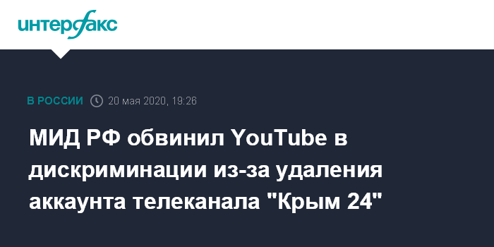 Москва. 20 мая. INTERFAX.RU - МИД РФ расценил удаление видео-хостингом YouTube аккаунтов телеканала "Крым 24", информагентств Anna News и News-Front как очередной акт дискриминации русскоязычных медиаресурсов со стороны подконтрольных США интернет-платформ.