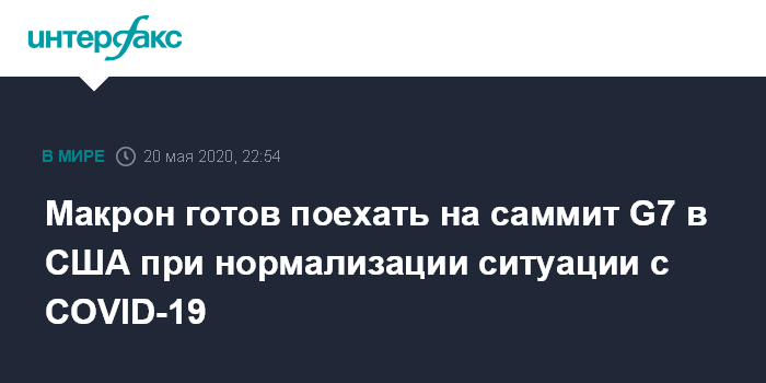 Москва. 20 мая. INTERFAX.RU - Президент Франции Эмманюэль Макрон готов отправиться в США для участия в саммите "группы семи" при условии нормализации эпидемиологической ситуации, сообщают французские СМИ со ссылкой на Елисейский дворец.