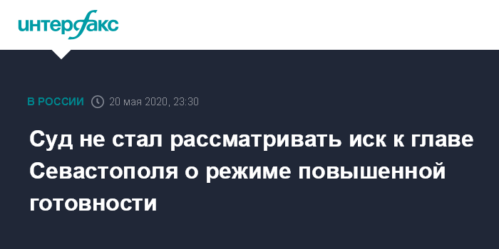 Москва. 20 мая. INTERFAX.RU - Севастопольский городской суд оставил в среду без рассмотрения иск, оспаривающий указ врио губернатора Михаила Развожаева о введении режима повышенной готовности из-за распространения коронавируса, сообщили агентству "Интерфакс" в общественной организации "Наш Севастополь", юристы которой подготовили иск.