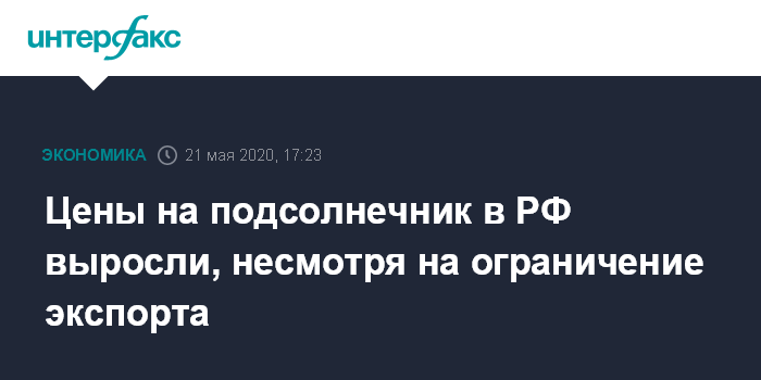 Москва. 21 мая. INTERFAX.RU - Цены на семена подсолнечника и соевые бобы в России выросли за месяц, несмотря на введение запрета на экспорт этих культур за пределы ЕАЭС с 12 апреля, который, как ожидали аналитики, должен был способствовать снижению стоимости.