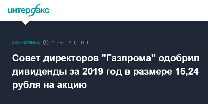 Москва. 21 мая. INTERFAX.RU - Совет директоров "Газпрома" в заочной форме одобрил рекомендацию правления выплатить дивиденды за 2019 год в размере 15,24 руб. на акцию, сообщил эмитент.