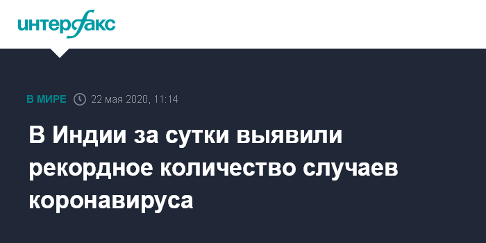 Москва. 22 мая. INTERFAX.RU - Медицинские службы Индии за минувшие сутки выявили рекордное количество случаев коронавируса COVID-19 с начала его вспышки в этой стране - примерно 6 тыс., сообщает в пятницу британское издание The Guardian.