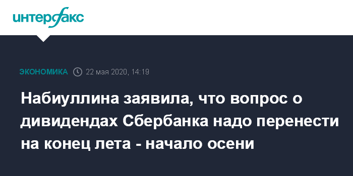 Москва. 22 мая. INTERFAX.RU - Вопрос о дивидендах Сбербанказа 2019 год надо перенести на конец августа - начало сентября, чтобы оценить потребность в капитале на фоне потерь из-за ситуации с распространением COVID-19, сообщила председатель Банка России Эльвира Набиуллина в ходе онлайн-конференции в пятницу.