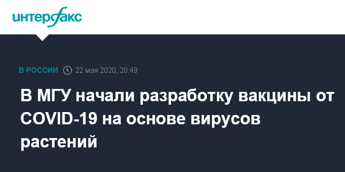 Москва. 22 мая. INTERFAX.RU - В МГУ имени Ломоносова сообщили, что разрабатывают вакцину от нового коронавируса на основе вирусов растений. Как сообщает вуз, Всемирная организация здравоохранения (ВОЗ) считает прототипы перспективными.