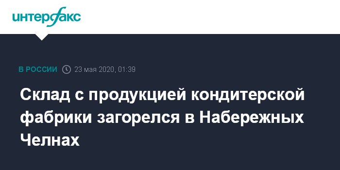 Москва. 23 мая. INTERFAX.RU - Склад готовой продукции кондитерской фабрики "Акульчев" горит в городе Набережные Челны в Татарстане, площадь пожара составляет 150 кв. метров, сообщили "Интерфаксу" в МЧС Татарстана.