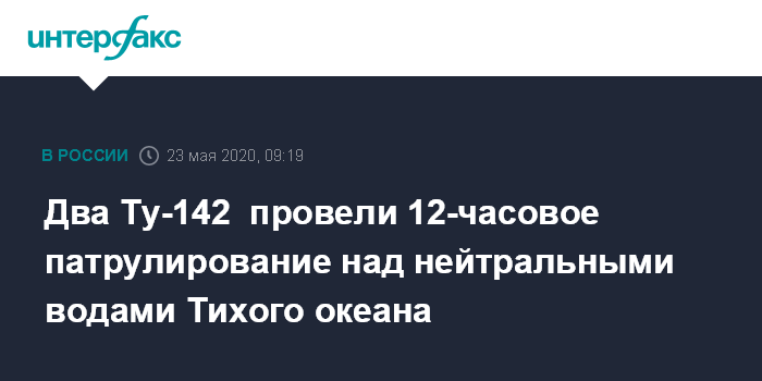 Москва. 23 мая. INTERFAX.RU -- Два российских дальних противолодочных самолета Ту-142М3 провели многочасовое патрулирование над Тихим океаном без нарушения международным норм, сообщил в субботу Тихоокеанский флот.